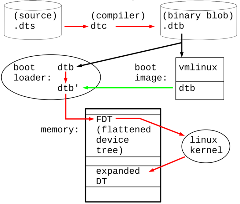 - 컴파일에 의해 생성된 .dtb파일은 boot loader에 의해 메모리에 FDT(flattened device tree)형태로 적재되고 이 후에 linux kernel에 의해 expanded DT형태로 변환되어 dt사용자가 API함수(eg. of_function)호출을 통해 dt를 사용할 수 있게 된다.
