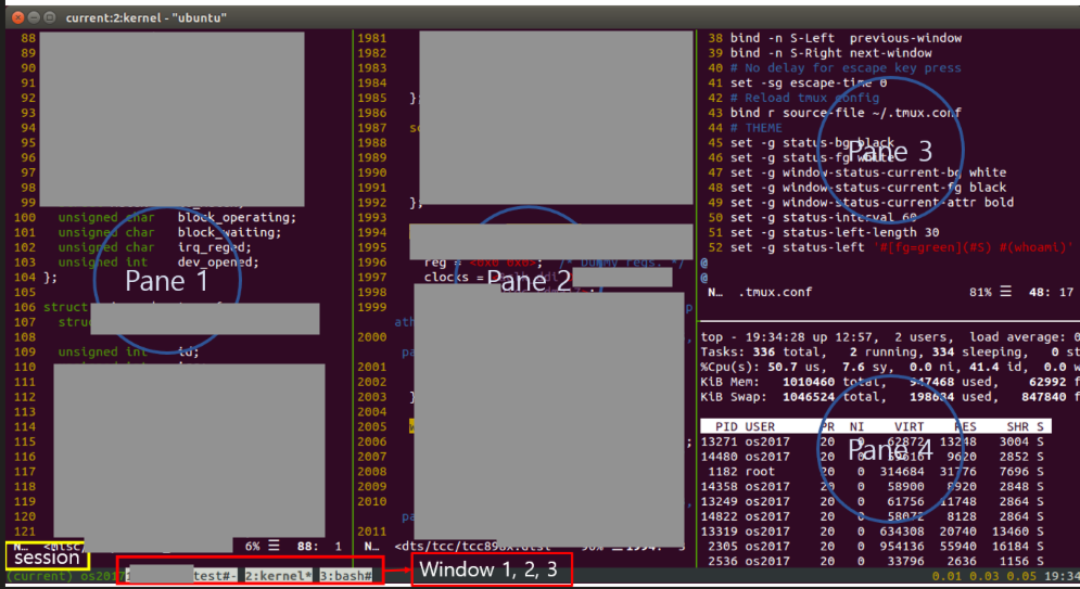 - Window : 터미널 화면, 세션 내에서 탭처럼 사용 가능 (아래 그림에서 3개의 window가 존재)